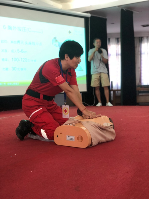 红十字会应急救护师资吴兰兰老师,就应急救护新概念、生活中的突发状况、心肺复苏等内容对学生进行了培训。为了使学生更深入地掌握心肺复苏要领,吴老师与学生借助模拟人模在现场展开了互动,手把手教授学生施救的方法,讲解注意事项。