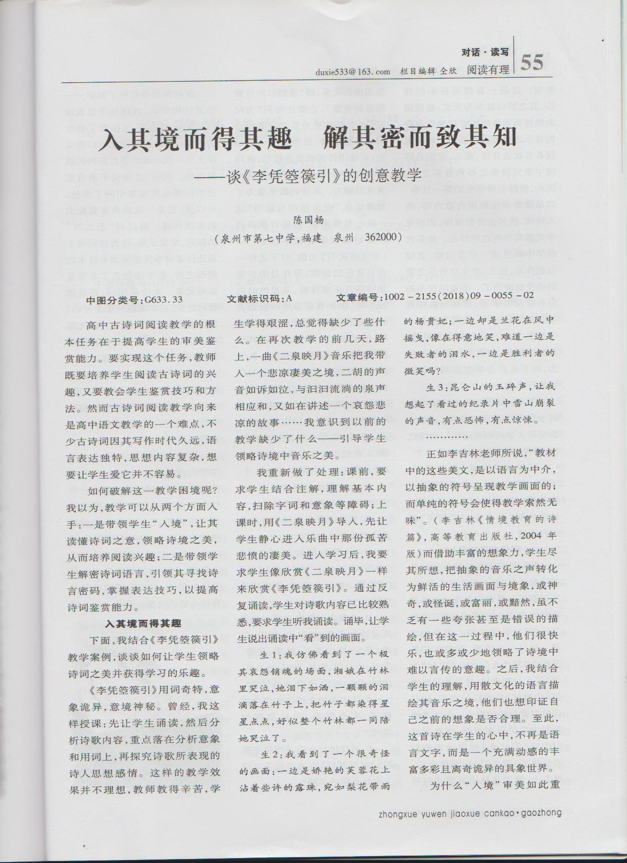 201809陈国杨《入其境而得其趣 解其密而致其知——谈<李凭谈箜篌>的创意教学》</李凭谈箜篌>