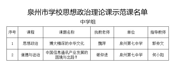 泉州七中2位教师获得泉州市学校思想政治理论课示范课