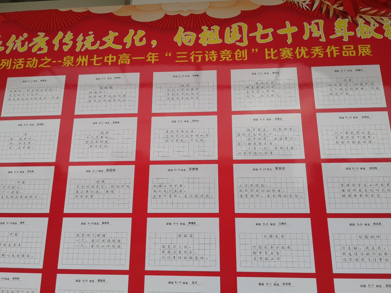 2019年12月中旬,我校高一年段举办“继承优秀传统文化,向祖国七十周年献礼”系列活动之“三行诗竞创”活动。