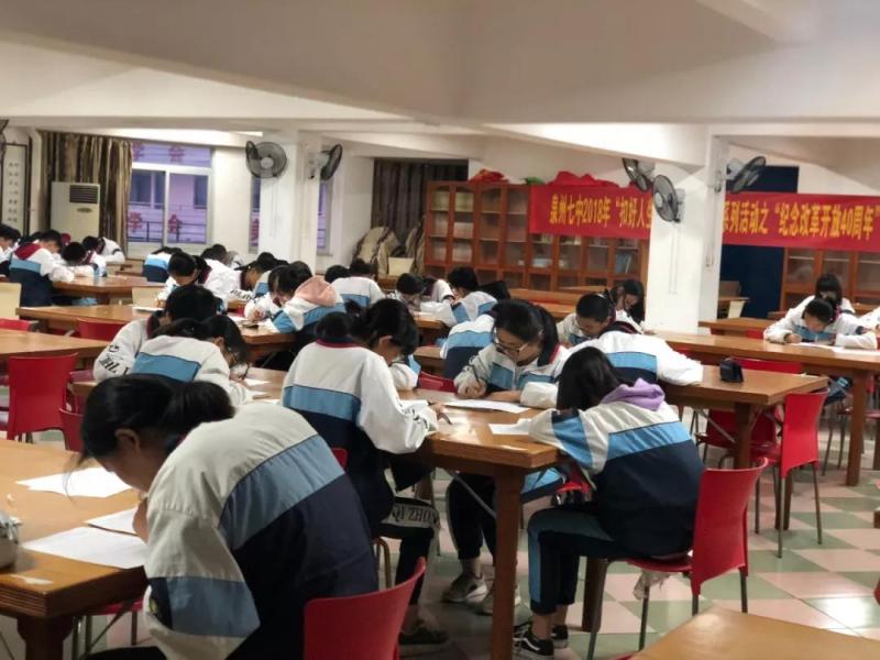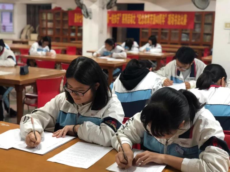 此次比赛吸引了高一、高二两百余名选手报名参赛。此次比赛分为硬笔书法和毛笔书法两个部分,限时45分钟,主题为“纪念改革开放40周年”。比赛过程中,选手们个个挥毫疾书,认真参与比赛。