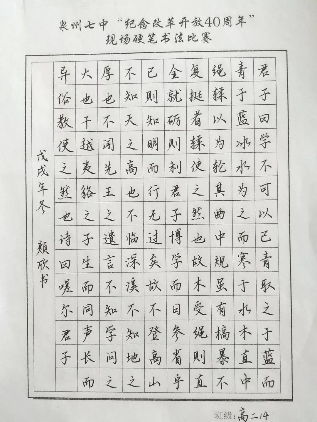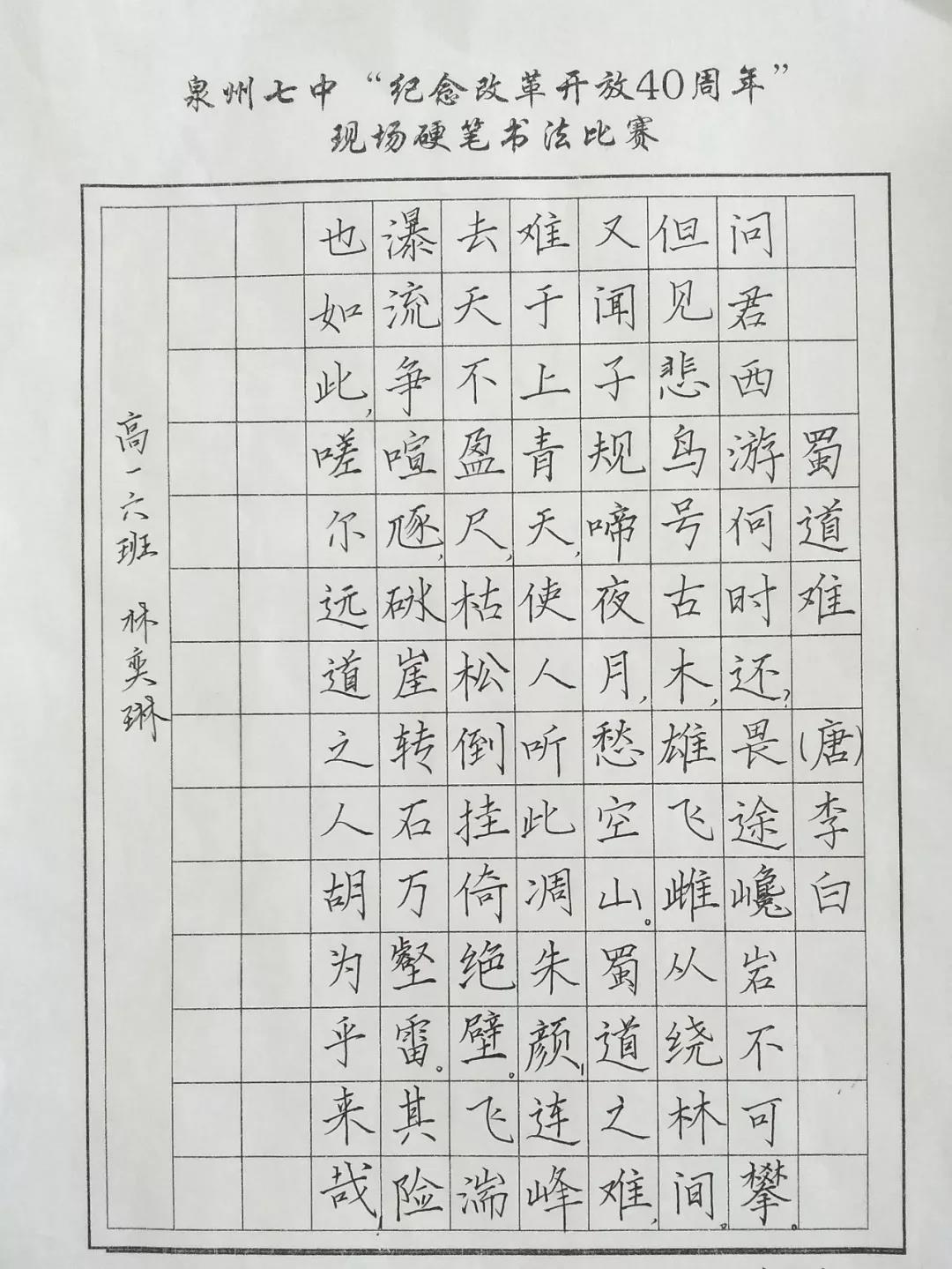 为纪念改革开放40周年,深入学习宣传贯彻习近平新时代中国特色社会主义思想和党的十九大精神,贯彻落实习近平总书记关于青少年“扣好人生的第一粒扣子”的指示精神,同时进一步弘扬中华民族的优秀传统文化,加强学校艺术教育,我校团委联合美术组于12月19日下午举办了“纪念改革开放40周年”现场硬笔、毛笔书法比赛。
