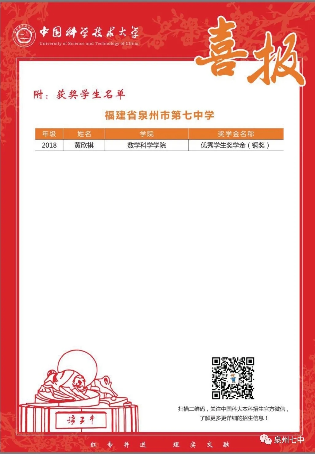 中国科技大学向泉州七中发来喜报