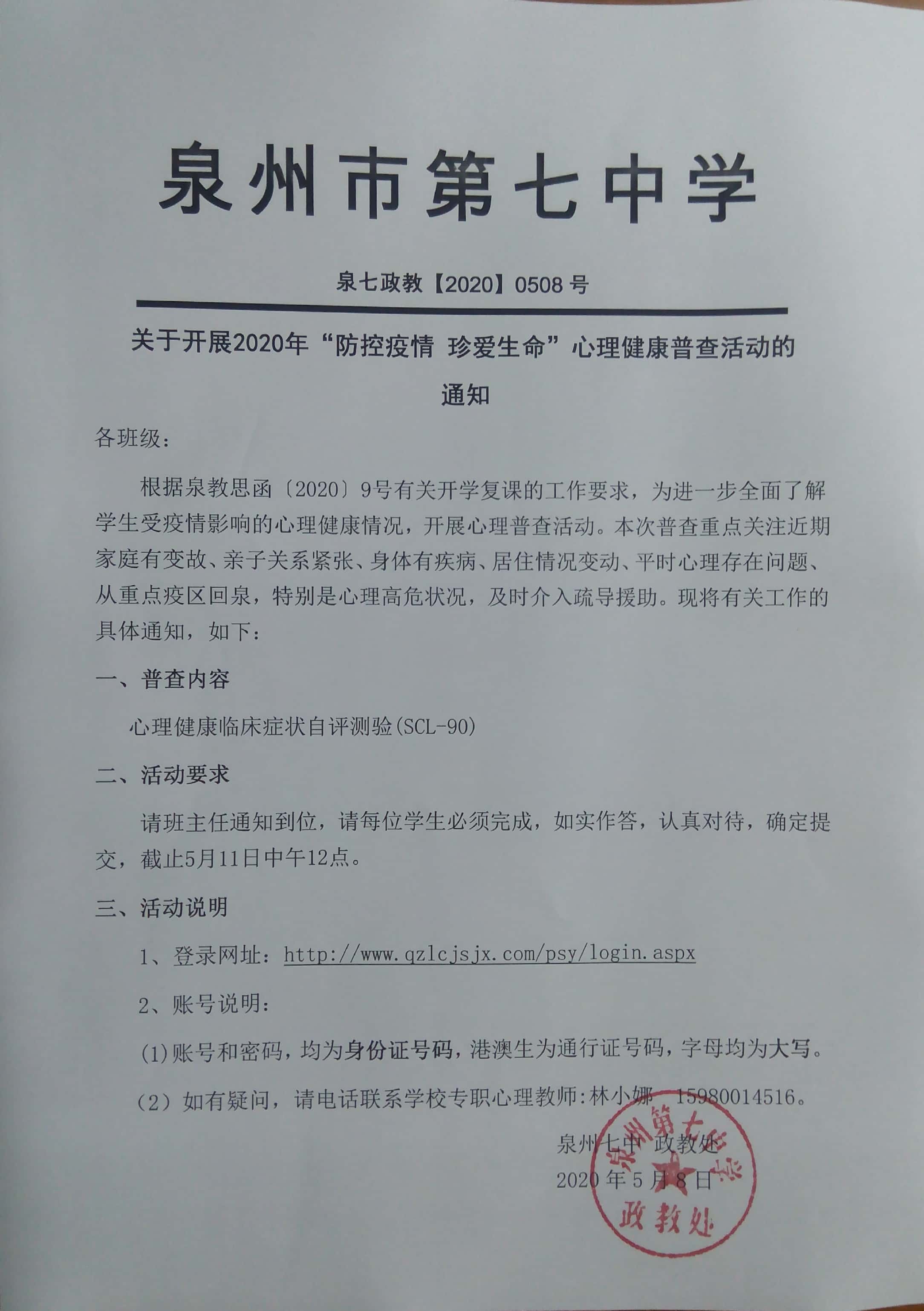 2020年新冠肺炎来袭,为进一步全面了解学生受疫情影响的心理健康情况,学校开展心理普查活动。本次采用SCL-90心理健康测试量表。该量表包含了90个项目,从感觉、情感、思维、意识、行为直到生活习惯、人际关系、饮食睡眠等多种角度,可以用于学生心理健康状况的评估。
