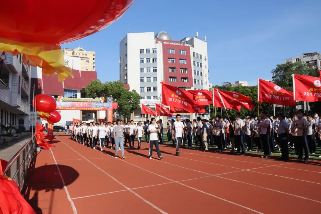 6月17日,泉州七中举行2020届“高三成人仪式暨冲刺高考誓师大会”。绿茵场上,红旗猎猎,高三学子身姿挺拔,士气高昂。