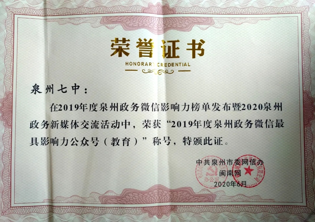 泉州七中连续4年获颁泉州政务微信最具影响力公众号(教育)