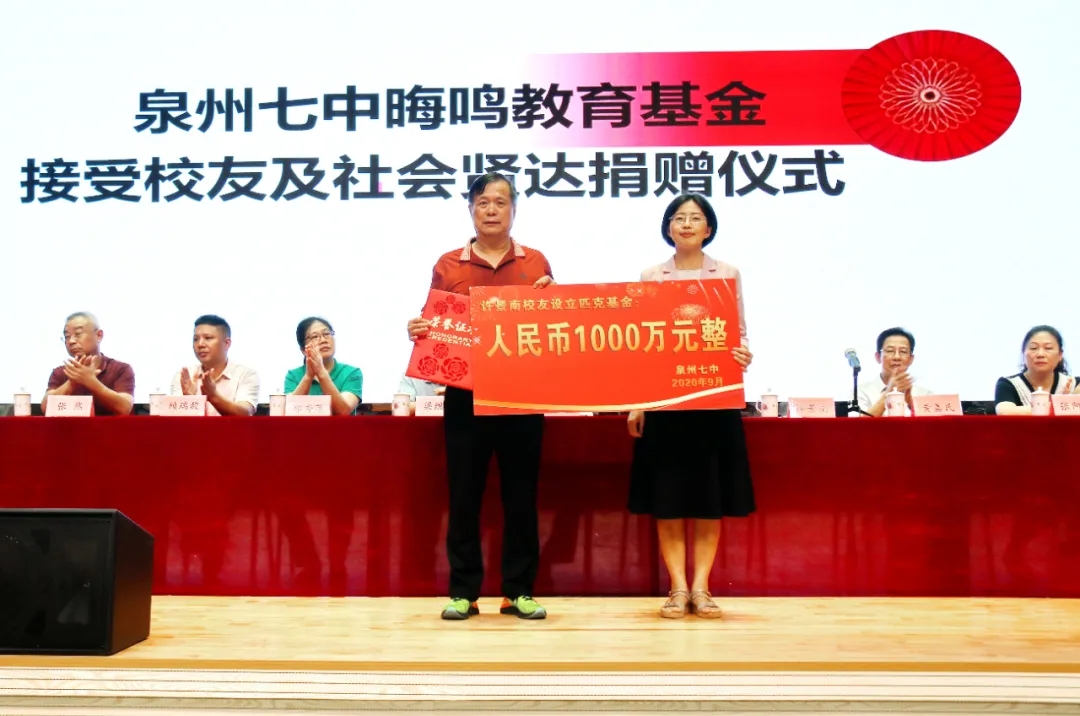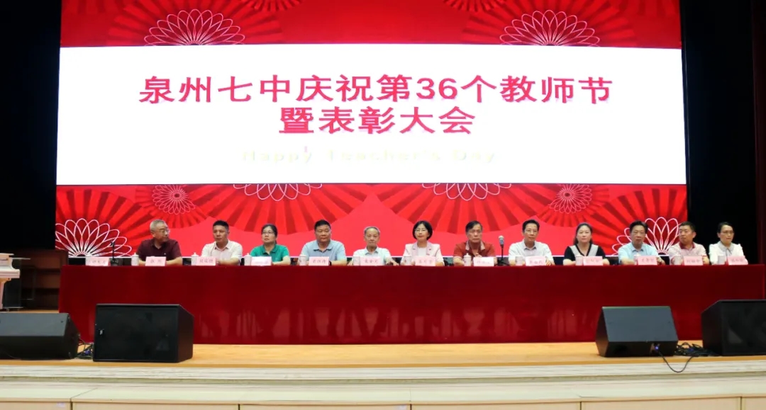 9月10日,泉州七中庆祝第36个教师节暨表彰大会、泉州七中晦鸣教育基金接受校友及社会贤达捐赠仪式在李群华体育馆举行。匹克集团有限公司董事长、泉州七中泉州校友会理事长、泉州七中助学奖学基金会会长、泉州七中高中74届许景南校友,通淮关岳庙董事长吴金炎先生,通淮关岳庙董事兼秘书长黄嘉民先生,福建省泉州市天成进出口贸易有限公司董事长、泉州七中助学奖学基金会副会长、泉州七中高中77届梁继进校友,南益集团福建有限公司泉州代表处郑秀莲总经理,福建金鹿日化股份有限公司董事长、泉州七中助学奖学基金副会长、泉州七中高中62届张华安校友之女、金鹿大酒店总经理张阿妮女士,泉州七中校友会秘书长、泉州木偶剧团原团长、泉州七中高中74届王景贤校友,澳洲皇家酒庄董事长吴有民先生代表赖瑞馥先生以及全体教师参加。表彰大会、捐赠仪式由我校党总支副书记林光灵、陈怡老师主持。