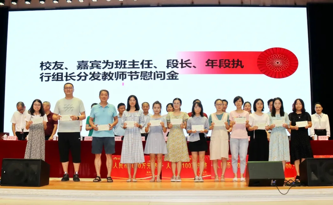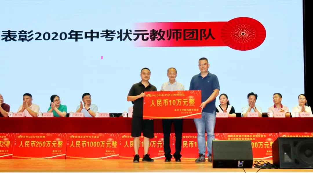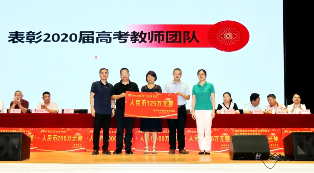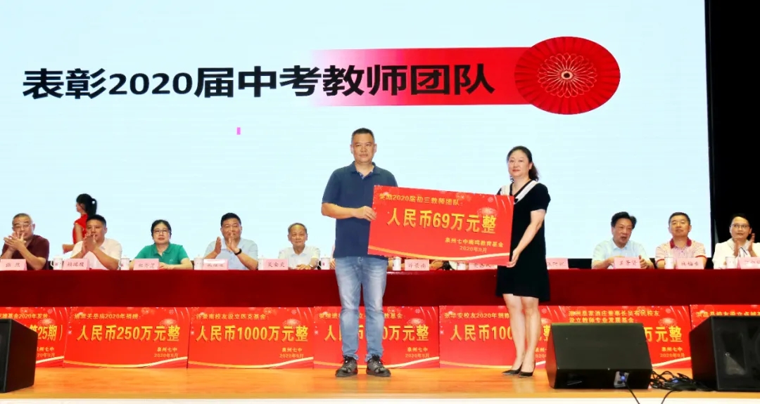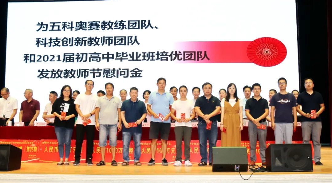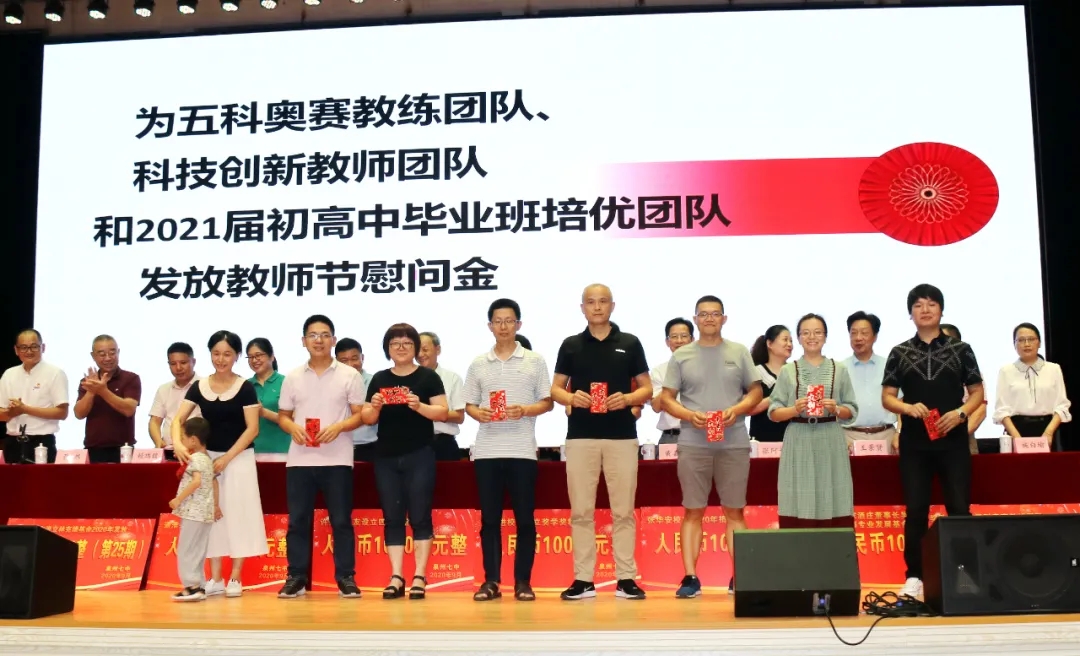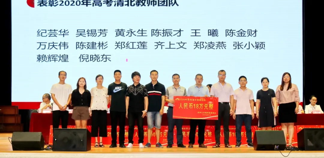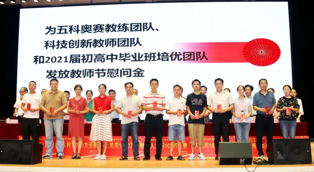 会上奖励2020届高考清北教师团队18万元,奖励2020届高三教师团队125万元,奖励2020届中考状元团队10万元,奖励2020届初三教师团队69万元,奖励2020届五科奥赛教练团队55万元;还奖励现任班主任、段长、执行组长、五科奥赛教练、科技创新指导老师、2021届初三、高三培优团队及初中部2019—2020学年上学期、下学期期末考试优胜班级19万元。