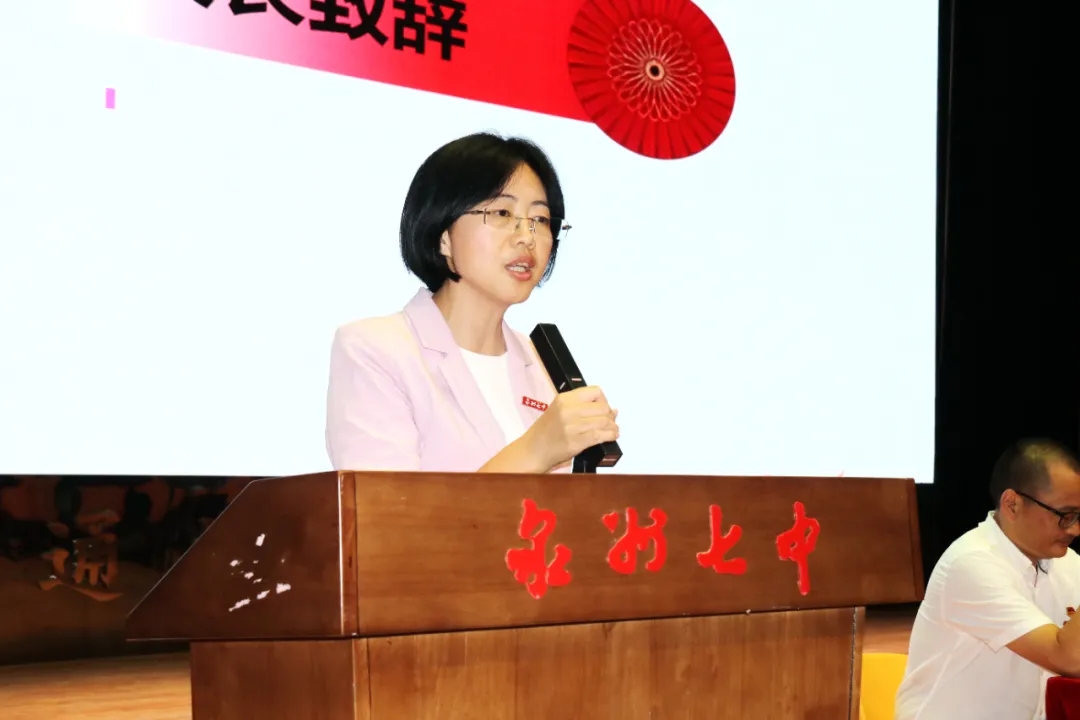 我校校长庄月芳代表泉州七中全体教师向百忙之中抽空莅临大会的各位校友、来宾表示热烈的欢迎!向长期以来一直关心支持母校教育事业发展,慷慨解囊的校友们表示诚挚的谢意,向辛勤工作在教育教学第一线,为学校发展呕心沥血的老师们道一声:“您辛苦了,祝你们节日快乐!”