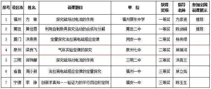 近日,省教育厅公布2020年省中小学实验教学说课比赛成绩。我校物理组梁良飞老师以市一等奖第一名的成绩代表泉州市参加省赛,获省二等奖(指导老师:林瑞河)。