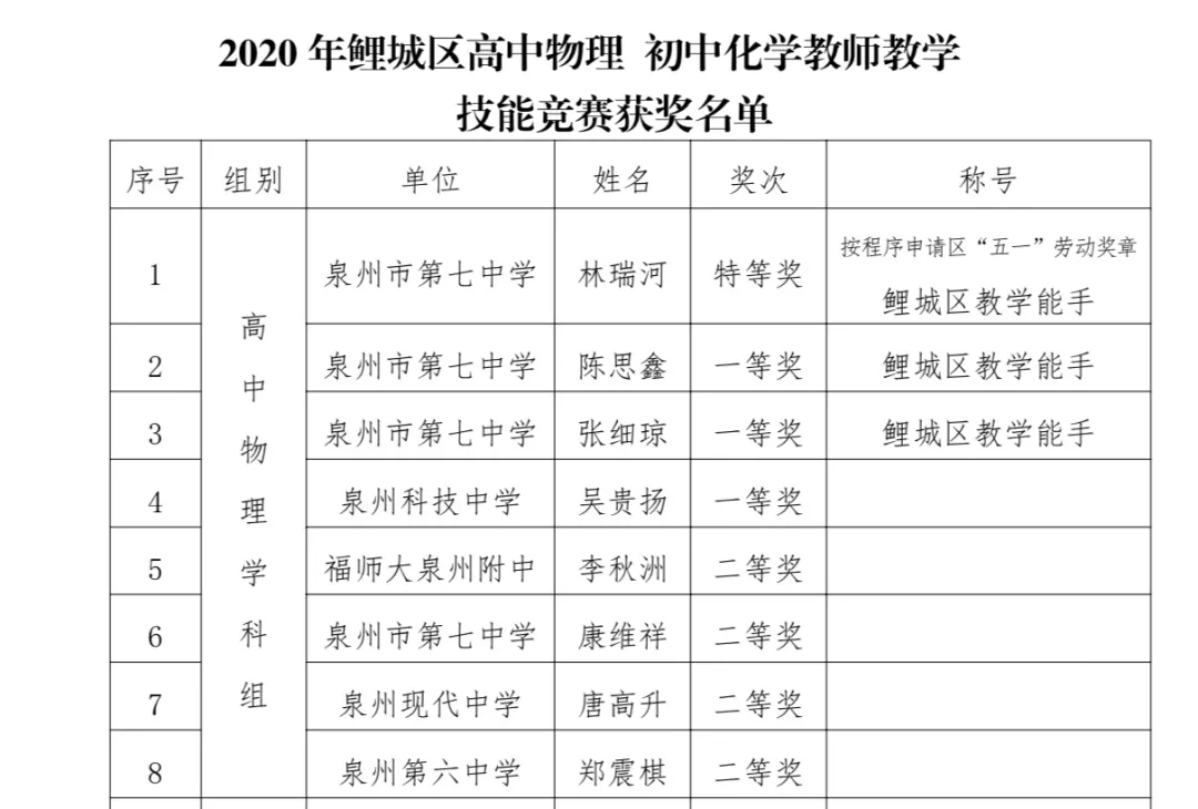 据泉鲤教工【2020】23号文件,鲤城区高中物理教师教学技能竞赛获奖名单揭晓:我校教研室副主任、物理教研组组长林瑞河获特等奖,荣膺鲤城区教学能手称号,并按程序申请区“五一”劳动奖章。陈思鑫、张细琼老师获一等奖,荣膺鲤城区教学能手称号,康维祥老师获二等奖。