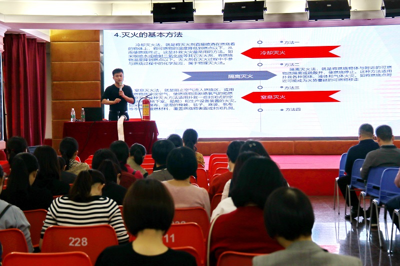 讲座中,陈俊灯讲师对生活中可能出现的火灾隐患、火场逃生、怎样扑灭初起火灾等问题一一进行解答。他结合火灾特点,讲解火灾基础知识、发生火灾的主要原因、防火的基本措施、灭火的基本方法、逃生方法、逃生要诀小结等基本常识,并采取亲身示范的方式为大家讲解了灭火器、防火面具的使用方法和注意事项。