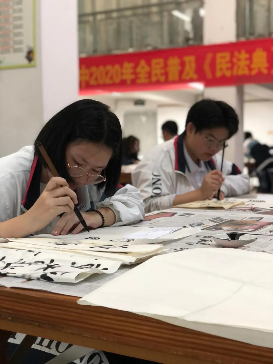 为深入贯彻落实习近平总书记关于广泛开展民法典普法工作的重要指示精神,增强青少年法治观念,提高学生的写字水平,近日由我校团委和美术组联合举办的“全民普及《民法典》”现场书画比赛在校图书馆拉开帷幕。