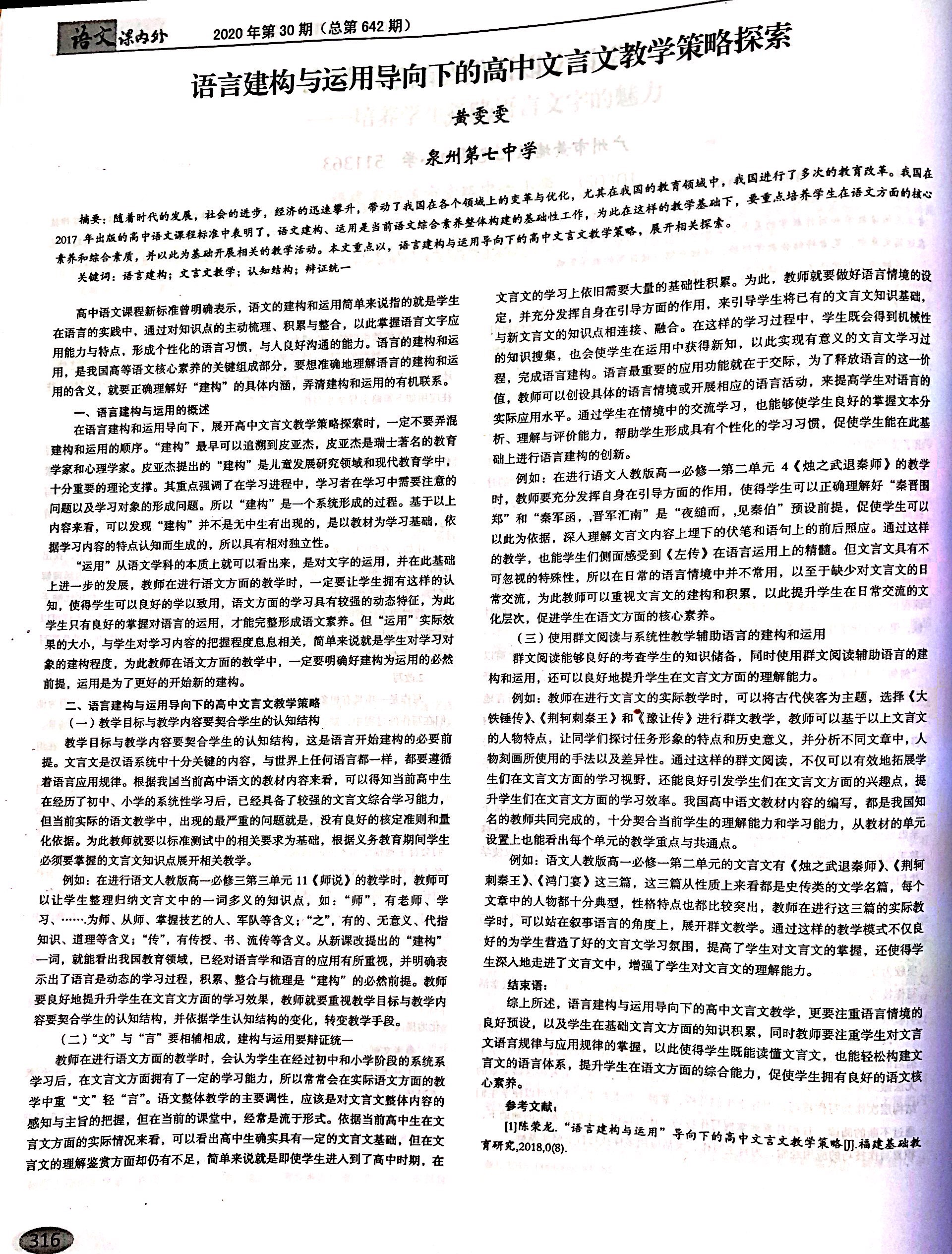 202012语文组黄雯雯《语言建构与运用导向下的高中文言文教学策略探索》