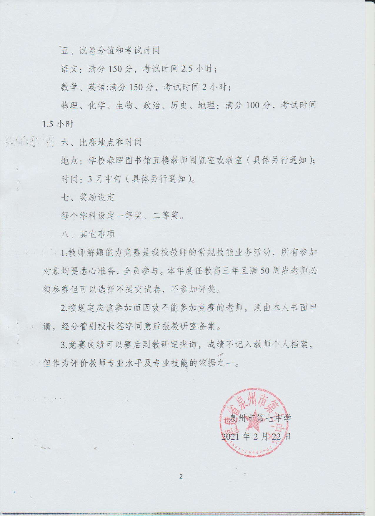 关于开展泉州七中2020-2021学年教师解题能力竞赛的通知
