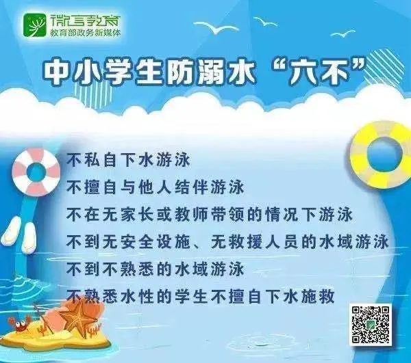 1.防溺水安全。炎夏将至,也到了学生溺水事故的高发期。为防患于未然,请家长和孩子一定要牢记防溺水安全常识,教育孩子做到“六不”: