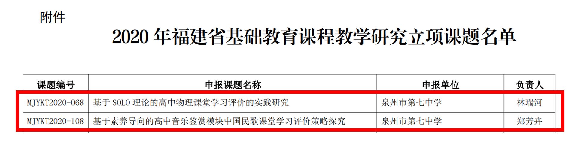 我校物理组、音乐组两项课题在2020年度福建省基础教育课程教学研究立项