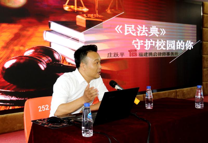 2021年5月26日,我校法治辅导员、福建腾启律师事务所庄跃平律师莅校举办《<民法典>守护校园的你》专题讲座,高二年段全体师生参加,讲座由林山段长主持。