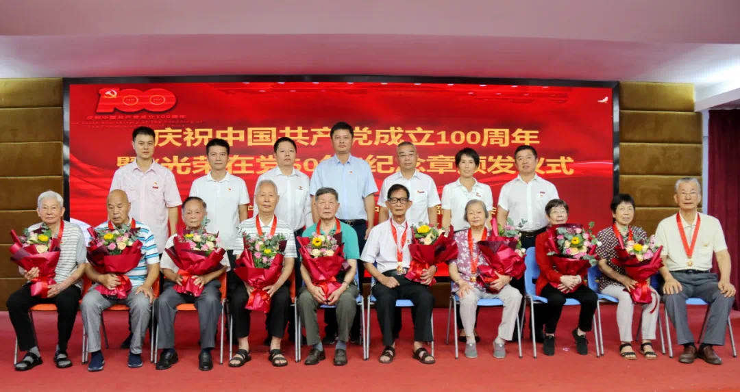 致敬老党员 奋斗新征程 在认真收看习近平总书记在庆祝中国共产党成立100周年大会重要讲话之后,学校党总支隆重举行了我校“光荣在党50年”纪念章颁发仪式。校总支委员出席颁发仪式并向老党员致敬慰问,参加大会的还有全体团支部书记和班长。吴鹏飞书记为老党员颁发纪念章,共青团员代表为老党员献花。纪念章蕴含的是无上的荣光,是永远的铭记;所有的老师和新一代青年都向老党员学习,党的优良传统和奋斗精神将代代相传。 党旗飘扬 党歌嘹亮 黄颖副书记宣读了2021年泉州七中优秀共产党员、优秀党务工作者表彰名单,共有49名优秀共产党员、5名优秀党务工作者受到表彰。 我校林岩等5名同志分别获得泉州市和鲤城区教育系统“优秀共产党员”、“优秀党务工作者”荣誉称号。在此特殊的时刻,学校也对他们进行表彰祝贺。沉甸甸的荣誉,既是对表彰对象突出业绩和优良作风的褒奖和肯定,也是对全校每一名党员干部的鼓励和鞭策。 林岩老师作为优秀党员代表上台发言。她表达了对党组织培养的衷心感谢,同时表示要继续学习先进典型,点燃榜样的力量,在服务人民上做表率,在担当实干上做表率,积极投入到新时代教育工作中,勇拼搏,勤奉献,向党交出一份满意的答卷。 吴鹏飞书记指出此次表彰大会的主要目的就是把党史学习教育进一步引向深入,激励全体党员干部在新时代新征程上更好展现党员教师的新担当新作为。号召全体党员要向先进学习,要坚定理想信念,忠诚于党、忠诚于人民。传承红色基因,赓续精神血脉,立足本职岗位、认真履职尽责,以优异成绩庆祝中国共产党成立100周年。接着,他带领所有党员高举右拳,重温入党誓词,铿锵有力地喊出了不忘初心、牢记使命的信心和决心。 在《没有共产党就没有新中国》的音乐声中,吴奕民老师指挥全场党员教师放声高歌,在党的颂歌中重温波澜壮阔的峥嵘岁月,汲取砥砺奋进的时代力量,表达了对党百年华诞的真挚祝福,展现了泉州七中启航新征程的昂扬斗志。