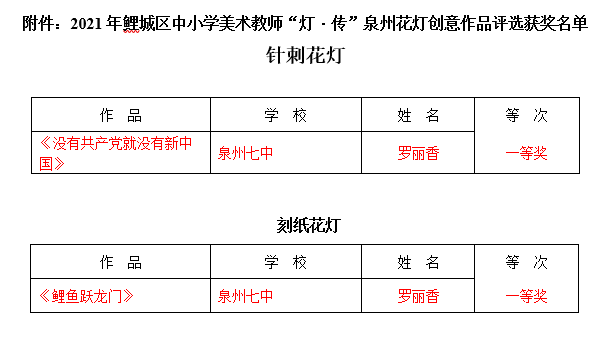 我校罗丽香老师在2021年鲤城区中小学美术教师 “灯·传”泉州花灯创意作品评选获奖