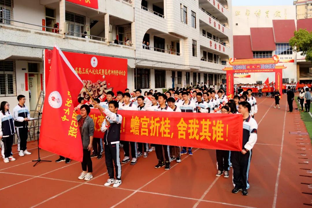 接下来,全体学生以班级为单位,踏进“奋斗门”,直达“状元门”,走向主席台,庄严誓师!彩旗飘扬的操场上,一阵又一阵地回荡着各班学生的铮铮誓言,令人热血沸!这是他们以青春的名义,为理想扬帆,他们将以梦为马,以笔为枪,背负今日誓词,征战高考考场!