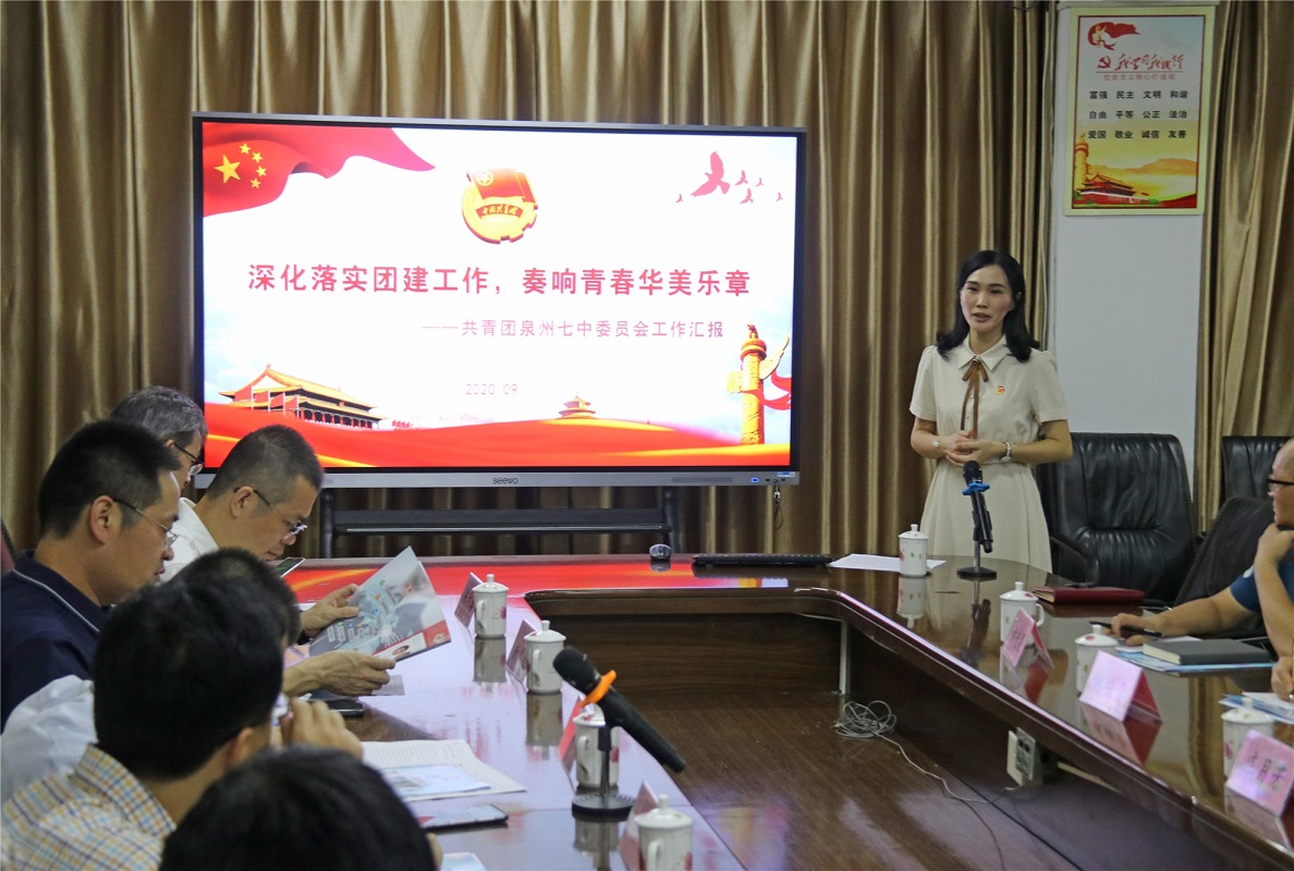 庄月芳代表学校对团省委一行的到来和对我校共青团工作一直以来的支持表示感谢,并表示学校将以本次调研指导为契机,进一步加强学校团委的建设,以党建带团建队建,加大创新创造创业力度,打造好泉州七中团学工作品牌,推动新时代中学共青团、少先队、学生会工作迈上新台阶。