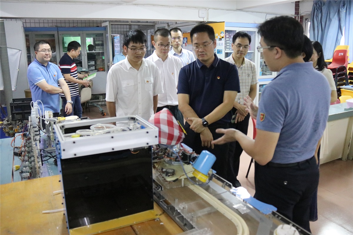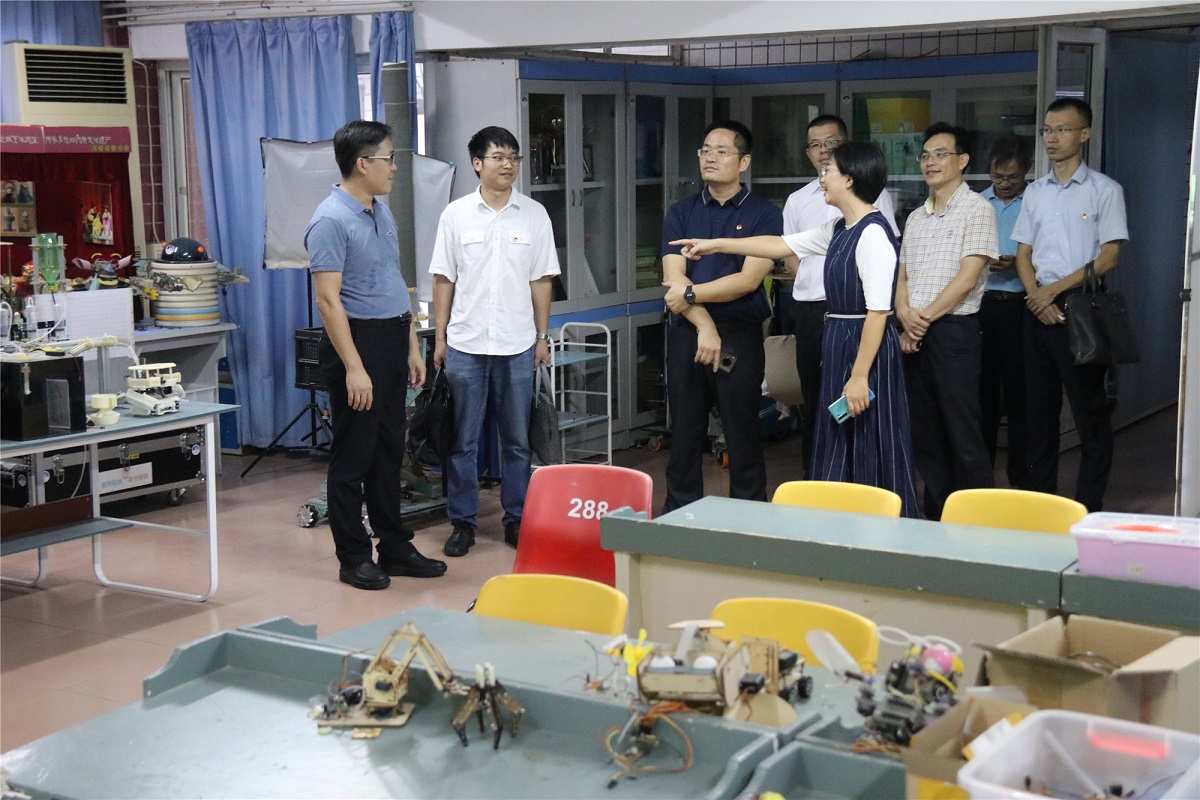 陈训明书记一行重点参观了我校具有特色的学生社团——机器人社团的活动室,并听取了机器人社团指导老师杨利关于机器人社团的活动开展情况及学生在机器人研发制作领域取得的一系列成果的汇报。