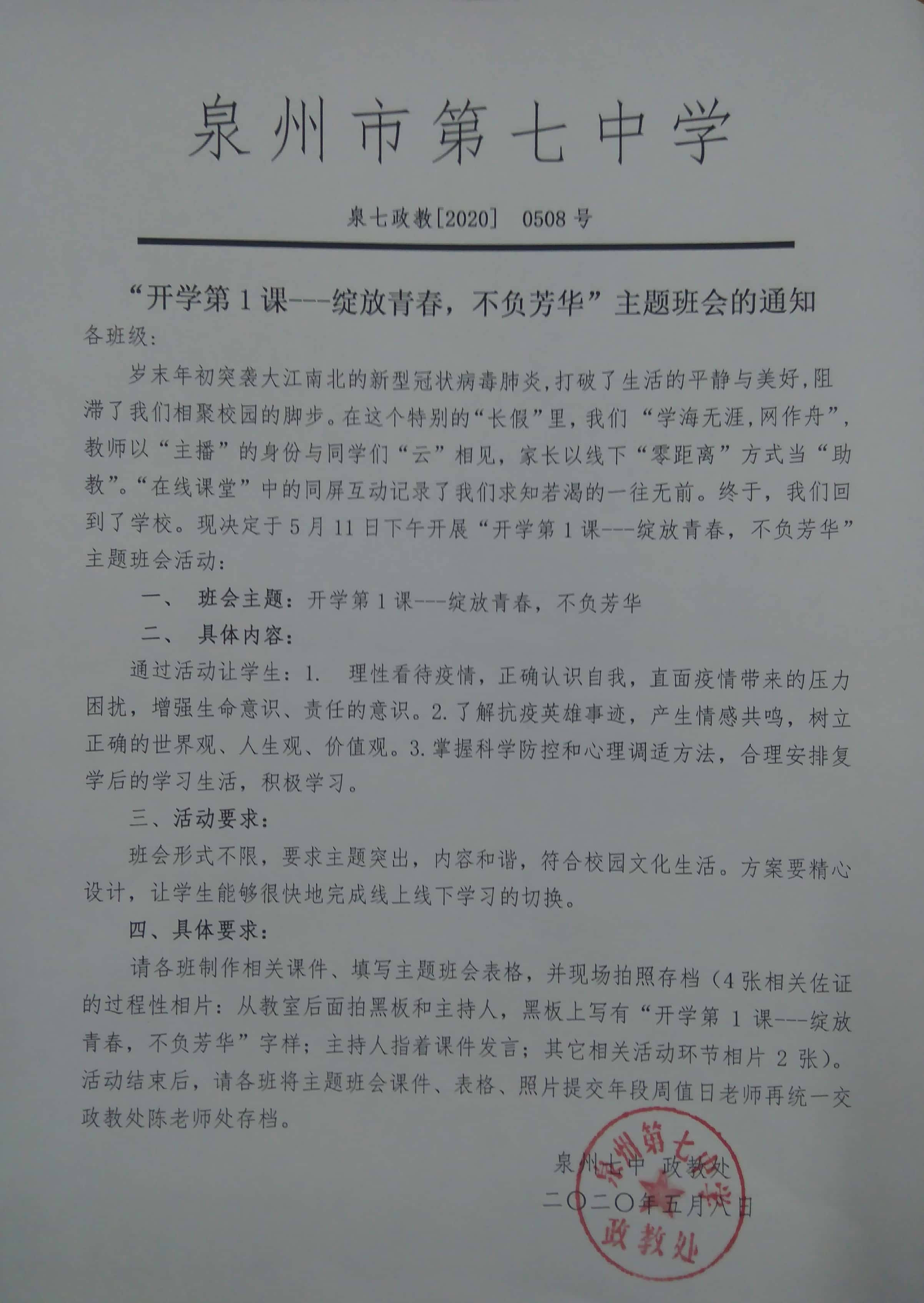 泉州七中开展“开学第1课——绽放青春,不负芳华”主题班会活动