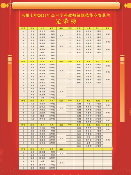 泉州七中2021年高考学科教师解题技能竞赛获奖光荣榜