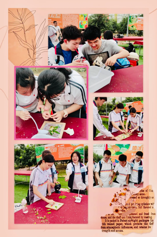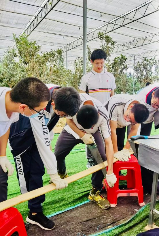 此次劳动教育实践活动以“赓续红色基因,劳动创造未来”为主题,内容丰富多样,包括春播一粒粟、创意花草纸制作、木工精工、非遗影雕多个项目。开营破冰后,各小组在教官和班主任的带领下分头行动。拓荒场地上,教官解说传统播种工具的使用方法,同学们或持耙,或把锄,或挥铲,松土、挖沟,平地,体验传统农耕之辛劳。在创意工坊里,同学们拌浆抄纸、摆花弄草、浇浆成型,感受古老手工造纸之意趣。在木艺工坊中,同学们锯、创、锥、凿,利用物理和数学知识制作特色秋千;在多媒体教室,同学们以石板为画布,以钢錾为画笔,凿凿切切,在石头上刻出画来,体会中国工匠之智慧与精神。