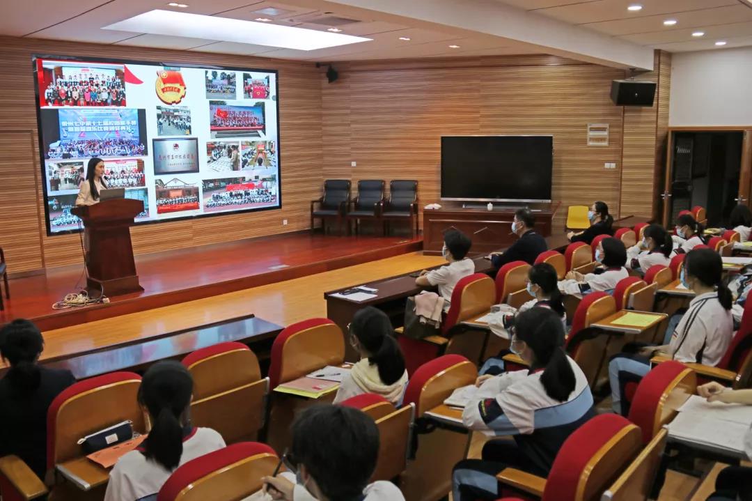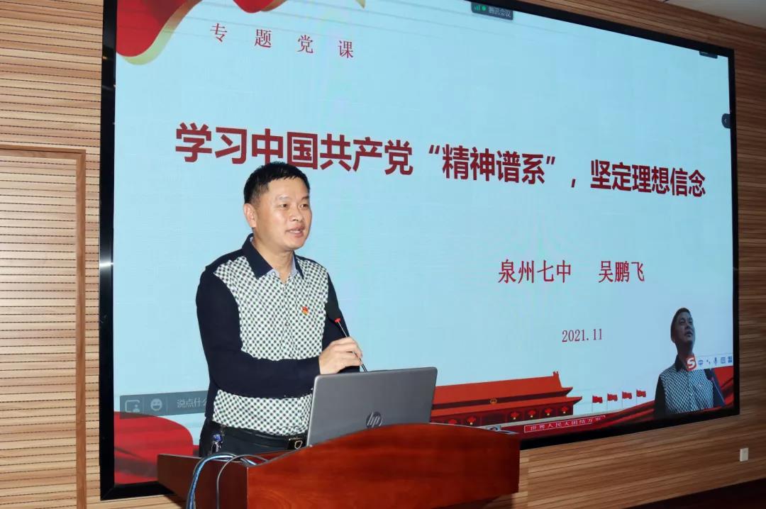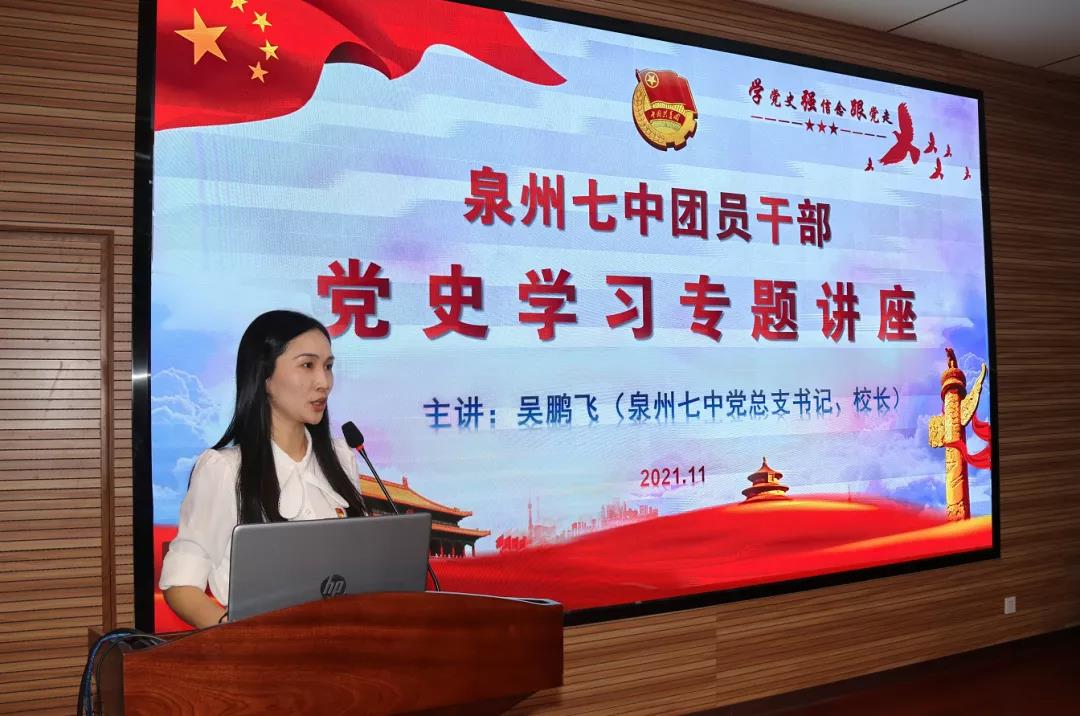 为深入推进党史学习教育,全面推进习近平新时代中国特色社会主义思想进学校、进课堂、进头脑,努力构建党建工作新格局,11月2日晚在城南校区学术报告厅,泉州七中党总支书记、校长吴鹏飞为学生团员干部、学生会干部上党课,党总支副书记黄颖,团委全体教师出席讲座,讲座由团委书记林岩主持。江南校区的团干通过网络直播在七中江南校区的报告厅同步学习。