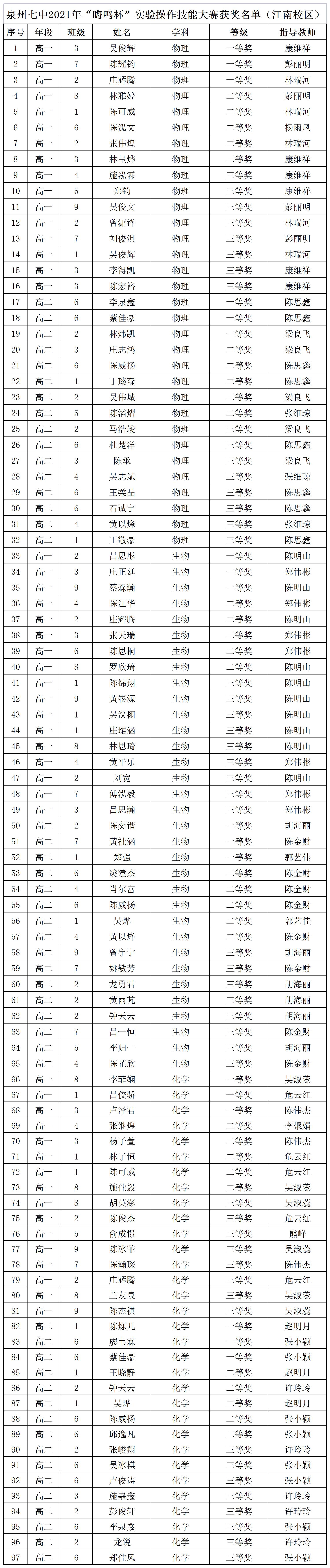 泉州七中2021年“晦鸣杯”实验操作技能大赛获奖名单