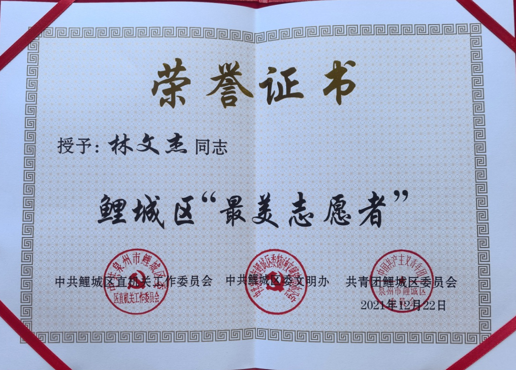 2021年12月22日,我校“晦鸣”青年志愿者服务队获评鲤城区“最佳志愿服务组织”,陈佳欣、林文杰两位同学获评鲤城区“最美志愿者”。此项评选由鲤城区直机关党工委、区委文明办、团区委联合组织,旨在进一步深化“文明创城 志愿同行”主题活动,表扬先进,树立典型,全面动员激励全社会积极参与志愿服务,积极投身全国文明城市创建。