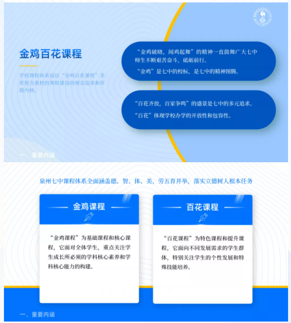 国家课程校本化,校本课程特色化,特色课程精品化,是泉州七中构建课程体系的基本思路。课程是学校教育思想、教学理念的集中体现,也是实现教育目标、支撑办学行为、促进学生全面发展的重要载体,更是创建学校特色、提高教师专业化水平、实现办学价值的主要平台,课程建设是学校教育的核心。“金鸡破晓,百花齐放”是泉州七中课程体系的特色凝练和生动诠释。泉州七中1931年建校,原名私立晦鸣中学,由丰子恺设计校标,于右任题写校名。“金鸡破晓,闻鸡起舞”的精神一直鼓舞广大七中师生不断艰苦奋斗,砥砺前行。“金鸡”是七中的校标,是七中的精神图腾。“百花齐放,百家争鸣”的盛景是七中的多元追求,“百花”体现学校办学的开放性和包容性。学校课程体系冠以“金鸡百花课程”非常契合我校的课程建设的理念追求和价值内核。