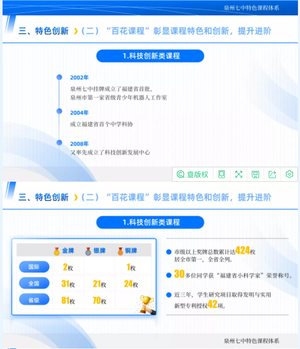 经过多年建设,泉州七中目前已形成较为完备的学校课程体系。近3年来,学校开发、开设了249门校本选修课程,20门精品课程对外示范辐射,课程体现人文底蕴、科学精神、健康生活、实践创新等核心素养。初步形成满足学生成长所必须的学科核心素养和学科核心能力的构建要求和学生个性发展和特殊技能培养需求的课程资源。形成富有特色的科技创新、学科奥赛、文体艺术、国际交流等四大亮点课程,并形成了丰富的课程建设实践成果,成为我校的办学特色和办学品牌。郑芳卉老师主持的《泉州南音:传承与创新及其在中学的二十五年教育实践》项目获2020年省级基础教育教学成果奖一等奖。杨利老师主持的《“做中学”:中学科技创新教育人才培养模式构建》获2017年省级基础教育教学成果奖二等奖。