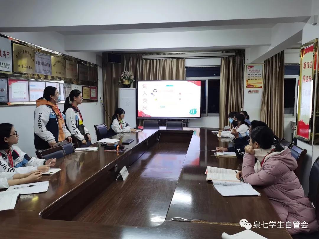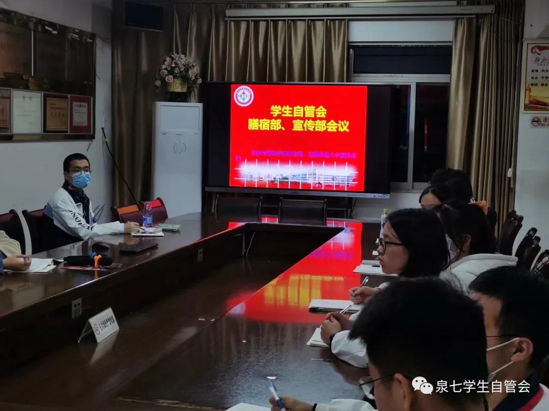 不知不觉中,学生自管会的新成员们已一起工作了半个多学期。为了让各班班长、宣传委员、生活委员更好的管理班级、宣传报道各班自我管理的经验建议,泉州七中学生自管会于2021.11.24日,周三晚在春晖楼六楼会议室召开了班联部、宣传部、膳宿部联席会议。