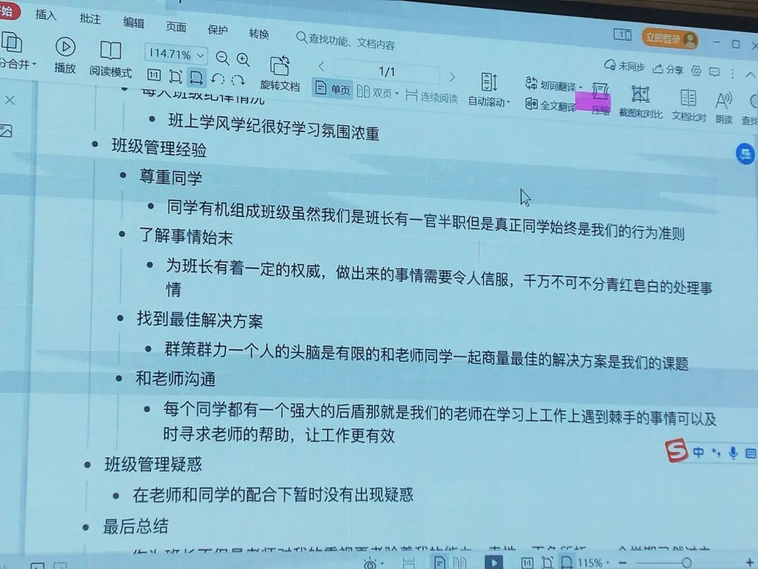 各班班长按照抽签顺序依次上台开始自己的演讲。有一开始有些紧张,但随着演讲的投入逐渐大方的;有临时被委以重任,但仍自信地上了台,毫无胆怯之色,谈吐自如的;有准备充分,一举一动尽显王者风范的;有幽默风趣,把台下的听众逗得哈哈大笑的……