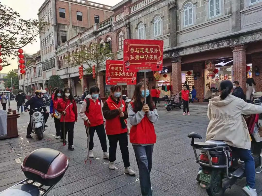 志愿服务“不打烊”,温陵古城更“温”暖。泉七学子纷纷利用春节、元宵节等重要时间节点,以班级或小组为单位积极参与维护公共环境卫生的社会公益活动,在天后宫、中山路、新天城市广场等地方都能够看到同学们身着红马甲的身影。