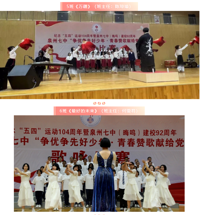 为深入学习宣传贯彻党的二十大精神和省委、市委、区委“深学争优、敢为争先、实干争效”的行动部署,继承和发扬“五四”爱国运动的光荣传统,展现泉州七中晦鸣学子昂扬向上、踔厉奋发的精神面貌,在第104个“五四”青年节到来之际,我校在江南校区体育馆举行纪念“五四”运动104周年暨泉州七中(晦鸣)建校92周年系列活动之“争优争先好少年·青春赞歌献给党”歌咏比赛。