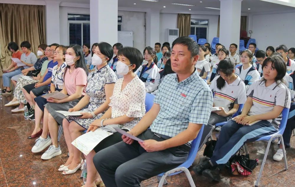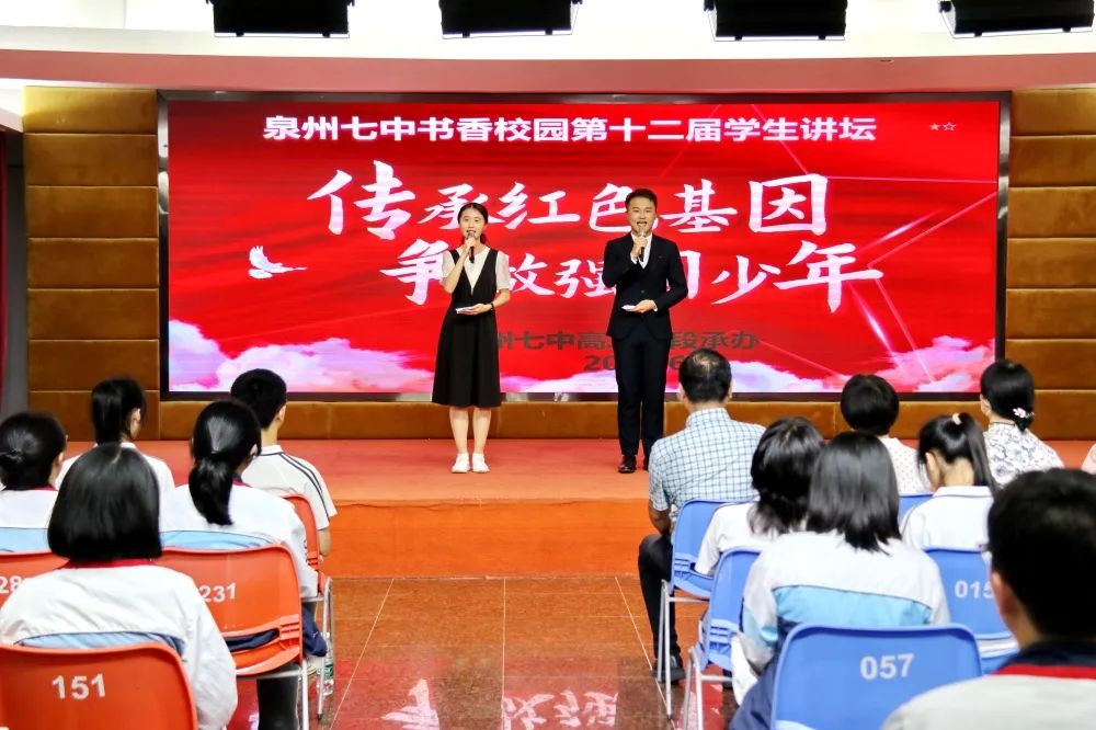读红色经典,展青年风采,源远流长的红色经典文学,是历史长河中永存的瑰宝,激励着一代又一代中华青年燃烧豪情,激扬斗志。采撷文字中的一抹书香,漫步成长路途的一方天地,是求知路上的一程理想之途。而这样路途,离不开校园活动的推进。泉州七中“书香校园”第十二届学生讲坛之“传承红色基因,争做强国少年”活动,6月2日晚在春晖图书楼九楼报告厅举行,讲坛由政教处“书香校园”活动组策划,城南、江南校区的高二年段共同承办。校党总支书记、校长吴鹏飞与江南、城南两校区的部分行政,高二年段语文老师,共享视听盛宴。