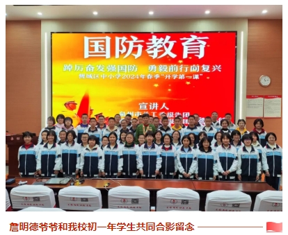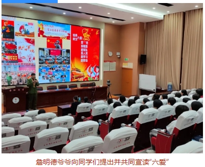 强国必先强军,强军才能国安。宣讲结束前,詹明德爷爷向同学们提出并共同宣读了“六爱”—— 爱党,爱祖国,爱军队,爱人民,爱学习,爱劳动。他指出,培养树立六爱要从学生时代抓起,通过这六爱,勉励同学们坚定人生志向、珍惜时间、刻苦学习、锤炼本领,把个人理想融入国家和中华民族的伟大复兴中,以实际行动践行爱国主义,努力成为国之栋梁!同学们慷慨激昂、热泪盈眶,宣讲活动在热烈的掌声中圆满落下帷幕。