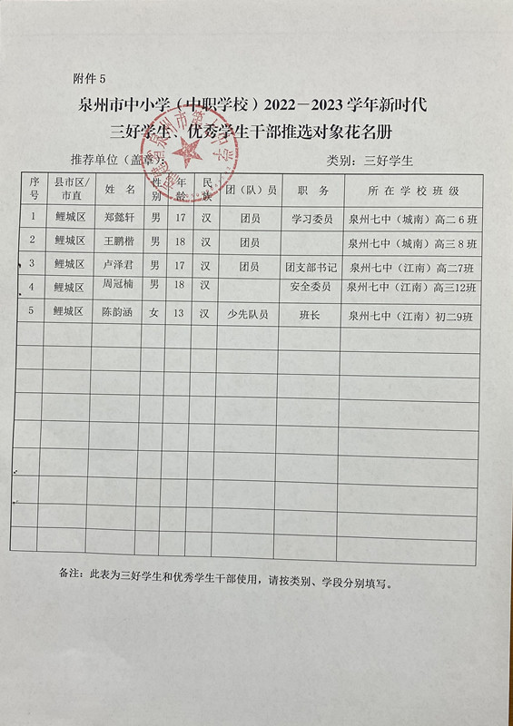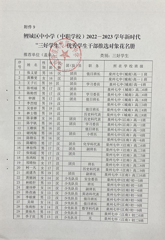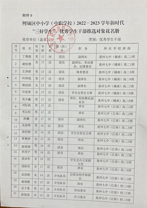 市、区 2022-2023学年新时代“三好学生”“优秀学生干部”“先进班集体”推选对象公示