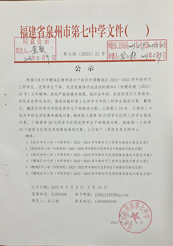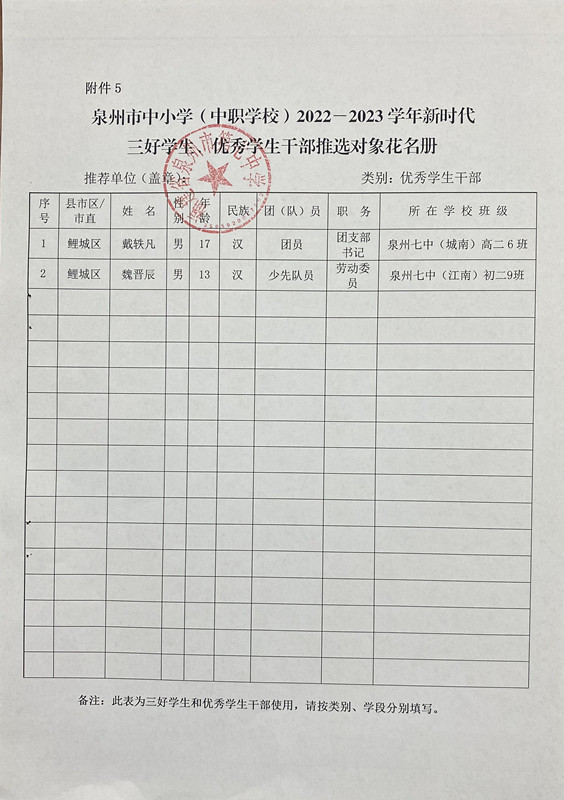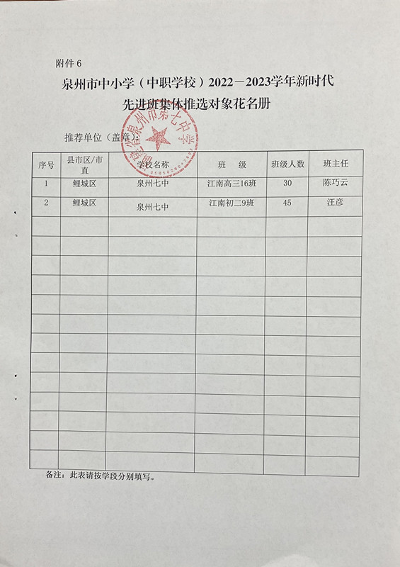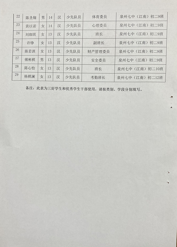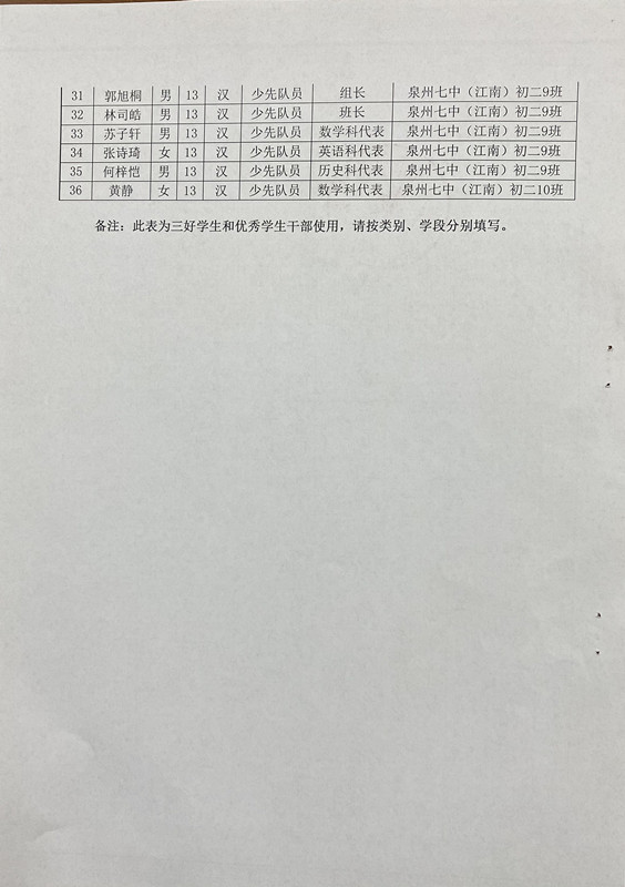 泉州七中“五育之星”推选对象公示