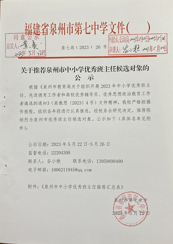 关于推荐泉州市中小学优秀班主任候选对象的公示