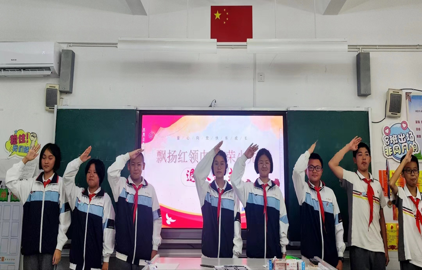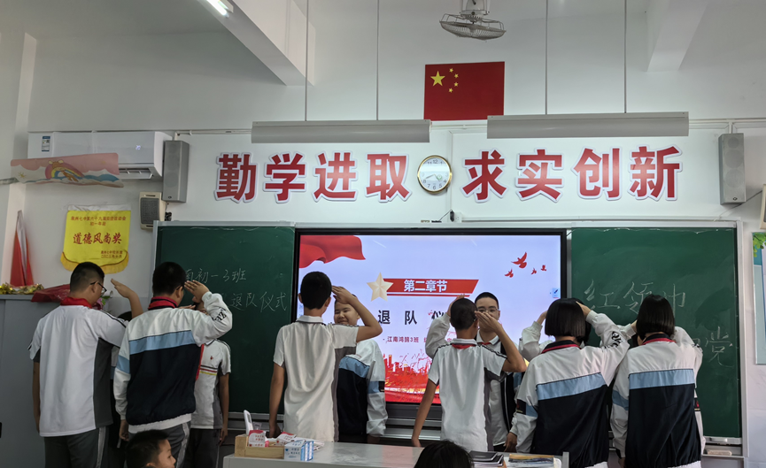 少年初长成,自在恰如风。在班主任的带领下,初一年各班开展少先队退队仪式,引导学子们迈好“青春第一步”。各班级队员两两一组,郑重为对方摘下了胸前的红领巾,并折叠好放于手心。队歌奏响,全体初一学子齐唱,行标准队礼,用嘹亮的歌声诉说斗志,表达对少先队组织的深深祝福。他们正式告别少先队,告别童年的稚嫩懵懂,迎接青春的热烈激昂。