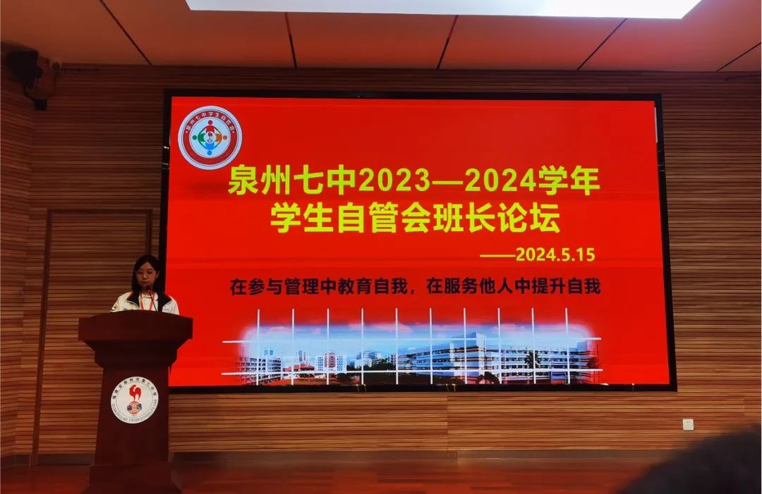 随后,泉州七中刘永斌副校长作总结发言,自管会的班长论坛是泉州七中学生自我管理的亮点,也是十年以来的岁月积淀。与此同时,也给各位优秀班长们提出了三点建议:一是保持思想上的先进,发自内心真诚与人沟通,才能百尺竿头更进一步。二是为成功找方法,敢于尝试,勇于担当,立足班情,发挥“伙伴重要理论”,不断提升班长管理效能。三是勇攀学习高峰,在锻炼中成长,不断互帮互助的同时也不能忘记学习,牢记主业,争取全面发展。