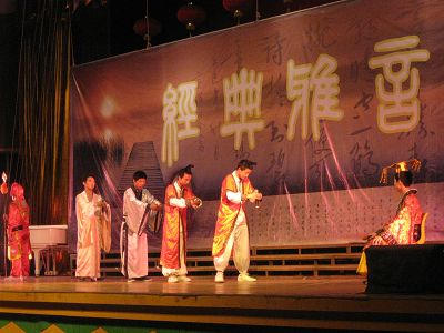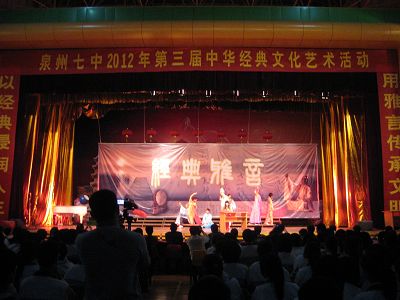 4月27日晚,泉州七中高一年段师生在李群华体育馆举行“书香校园之经典诵读”活动,该活动是由书香校园活动小组策划发起,高一年段语文组组织,校团委、政教处协办的第三届经典文化艺术晚会。时尚文化专家、丰泽区文化馆傅树明馆长,陈龙斌校长,庄月芳副校长,吕端芳校长助理,郑德强主任,杨建益主任,谷小艳副主任及校图书馆张育萍馆长等出席了本次活动。本次活动共17个节目,既有缠绵悱恻的爱情悲剧《宝玉成亲,黛玉病死》,也有慷慨悲壮的历史英雄剧《楚魂》,更有滑稽风趣古灵搞怪的现代版《空城计》,此次晚会大多以舞台剧和诗朗诵的形式展现。