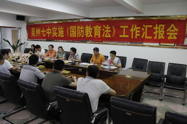 检查小组首先听取了我校陈龙斌校长关于国防教育工作情况的汇报,然后查阅文件资料、与各学科老师座谈交流。市委宣传部宣传科胡志春科长对我校贯彻实施《国防教育法》给予充分的肯定,最后用四句话高度概括了我校国防教育:国防教育领导主动、国防教育形成合力、国防教育抓出特色、国防教育成效明显。同时对今后国防教育提出了建议:第一、国防教育工作须紧紧围绕爱国主义主题,坚持以德育为本,激发学生的爱国热情,培养国家安全意识;第二,要认真贯彻《国防教育法》,细化教学内容,做到国防教育形式丰富多样化,在发挥军训为主形式的基础上,拓展第二课堂的形式,丰富获取国防知识的途径;第三,利用课堂,结合学科教学,把国防教育做成模块系列。