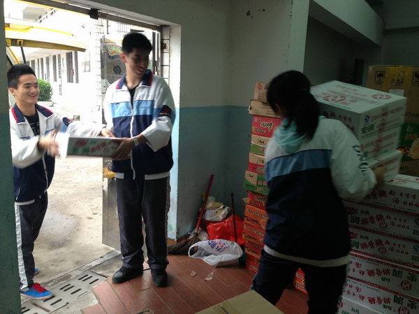 同学们秉着“一方有难,八方支援”的精神,积极响应学校号召,课下将自己购买的各种食品、药品、卫生用品等爱心物资纷纷送往学校舞蹈厅。学生会的学生干部们也利用课余时间认真地对各项物资进行了归类整理。