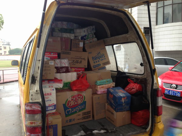 截至4月25日下午放学时间,团委会累计收到来自全校同学们的各项捐献物资总价值约达2000元,这些爱心物资将统一由韵达快递公司免费运往灾区。